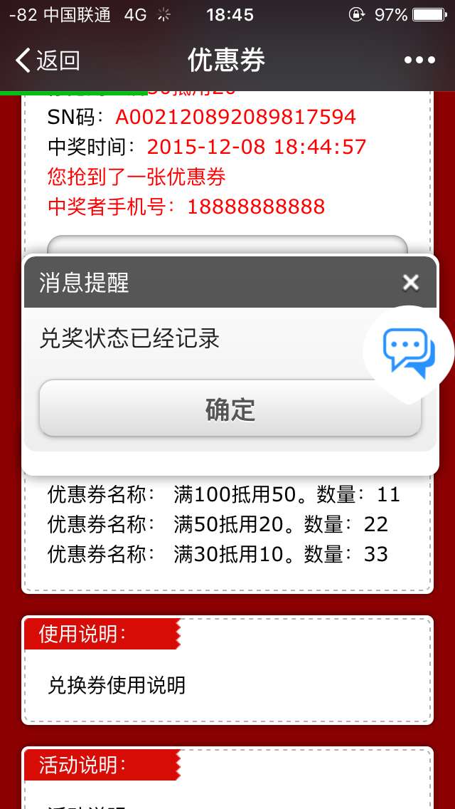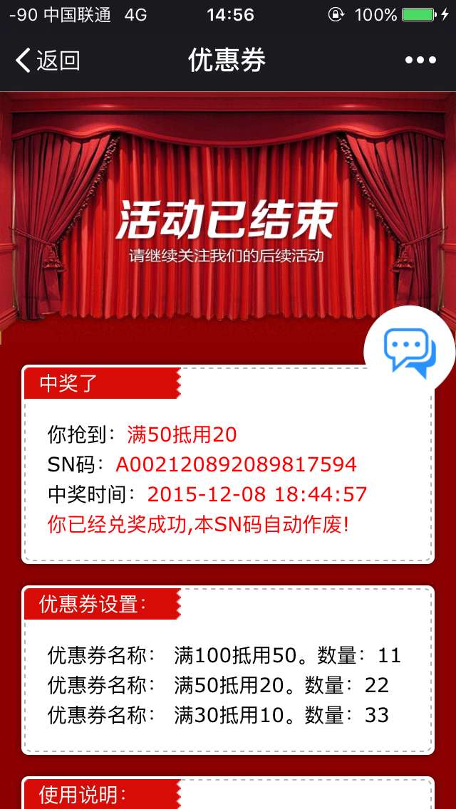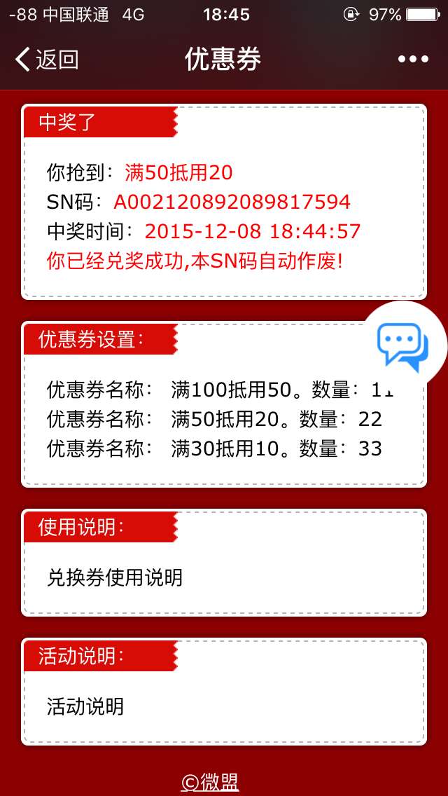 优惠券设置简便,商家只需设置活动名称、活动时间、活动奖项等基本信息。用户通过关键词进入活动界面,即时提示是否抢到优惠券,先到先得,粉丝参与活动简单便捷,是商家吸引粉丝和回馈粉丝的一款很有效的营销活动。